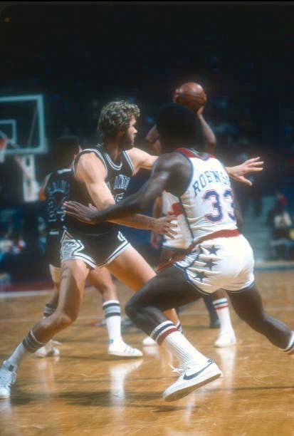 ![]() Coby Dietrick (25), Willie Sojourner (40), Wendell Ladner (4), Julius Erving (32) San Antonio Spurs at New York Nets From www.gettyimages.com |