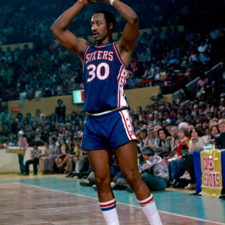 ![]() Billy Knight (25), Wil Jones (22), George McGinnis (30) Philadelphia 76ers at Indiana Pacers Wearing 1975-76 Jersey |