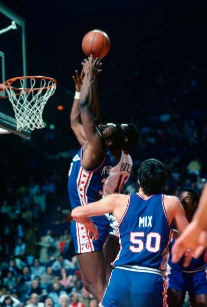 ![]() Billy Knight (25), Steve Mix (50), Caldwell Jones (11) Indiana Pacers at Philadelphia 76ers |