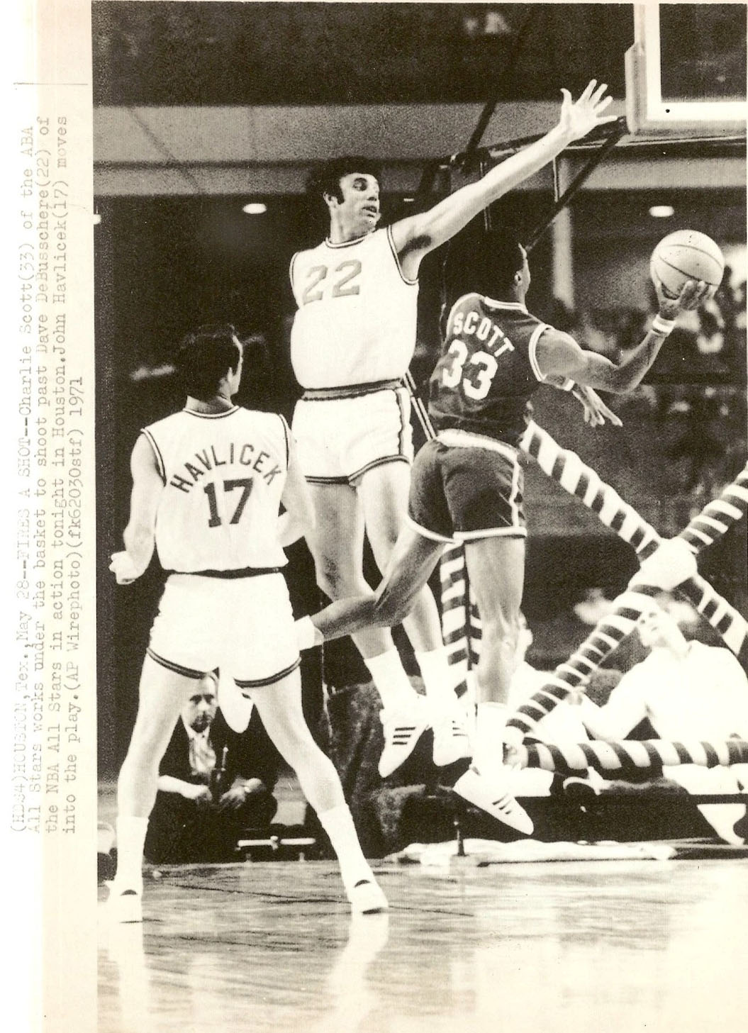 ![]() Charlie Scott (33), Warren Davis (32), Bill Bunting (16) Virginia Squires at Carolina Cougars` |