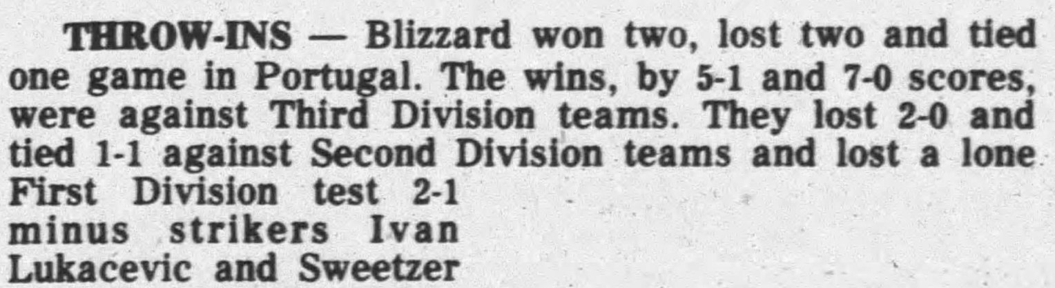 Alvor, Portugal) Date: March 12, 1980 Blizzard won 7-0 Attendance:? Goals: Blizzard-Ivan Lukacevic (5), Peter Lorimer, Cliff Calvert |