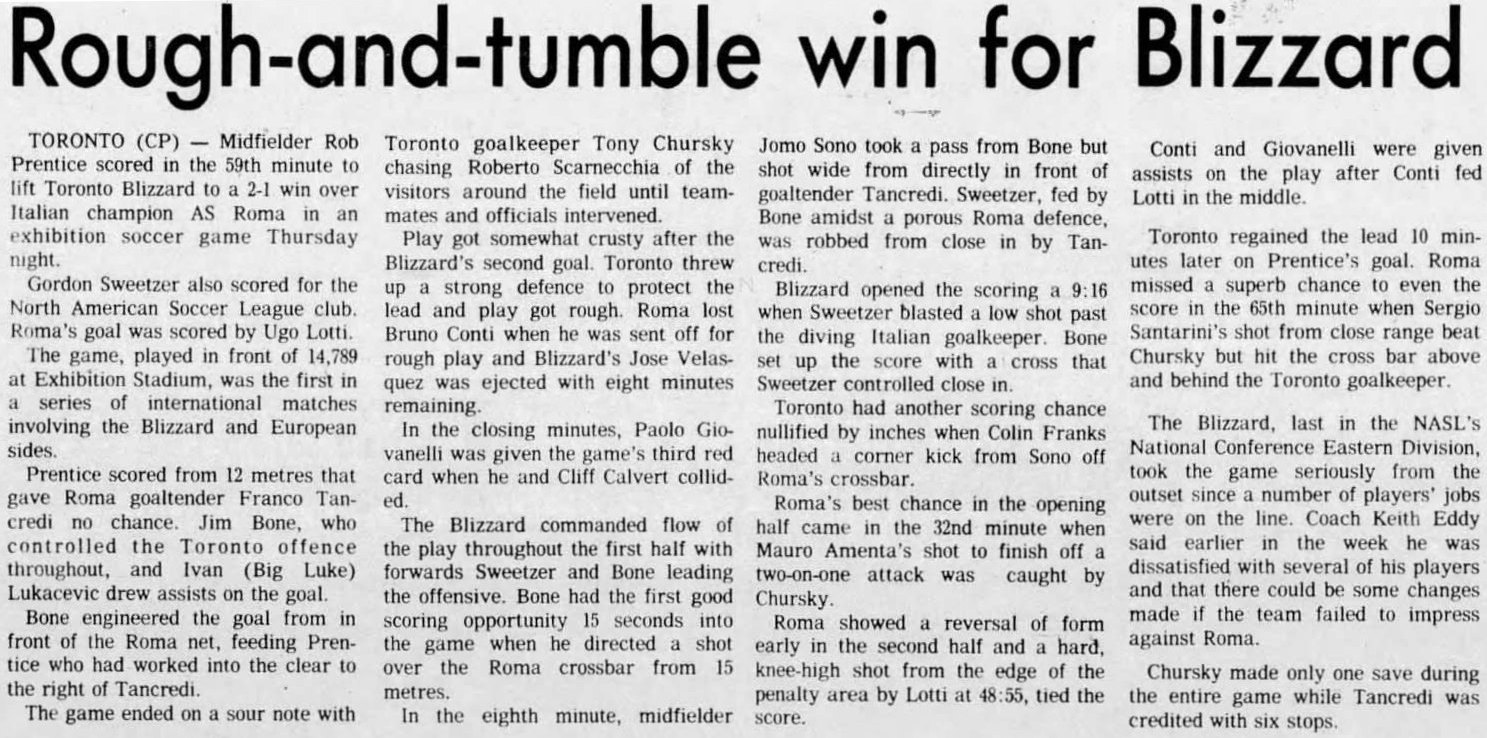 | Roma (Italy) at Toronto Blizzard Date: May 29, 1980 Blizzard won 2-1 Attendance: 14,789 Goals: Toronto-Rob Prentice, Gordon Sweetzer Roma-Ugo Lottie |