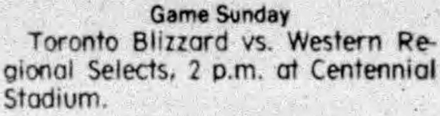 | Toronto Blizzard at Vancouver Whitecaps Date: March 23, 1980 Blizzard lost 2-1 Attendance: 8,554 Goals: Blizzard-Cliff Calvert Whitecaps-Trevor Whymark (2) |