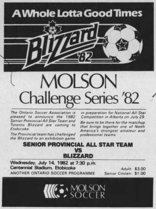 All-Stars (Sault Ste. Marie, Ontario) Date: August 5, 1981 Blizzard Won 1-0 Attendance: 3,100 Goals: Blizzard-Clyde Best |