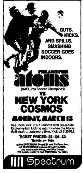 (Indoor) Date: March 18, 1974 Cosmos lost 5-3 Attendance: 6,314 Goals: Atoms-Paul Child (2), Karl Minor (2), Hugh O'Neill Cosmos-Barry Mahy, Joey Fink, Jorge Siega |