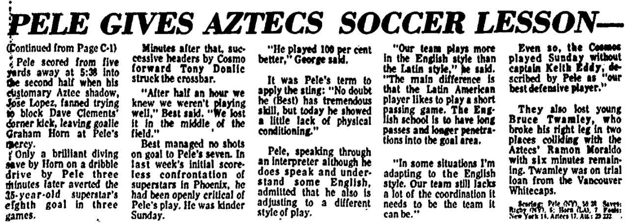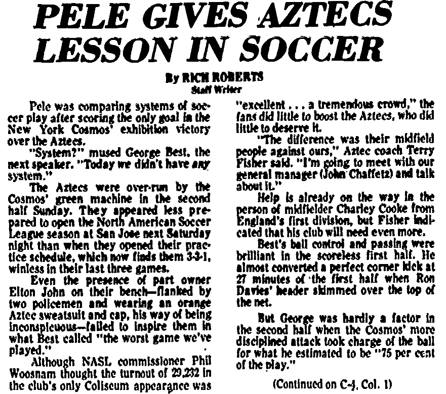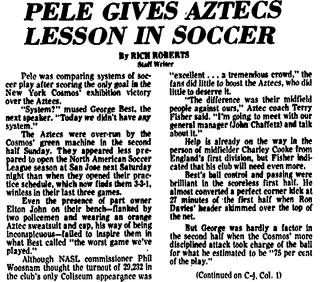 | New York Cosmos at Los Angeles Aztecs Date: April 11, 1976 Cosmos won 1-0 Attendance: 29, 232 Goals: Cosmos-Pele |