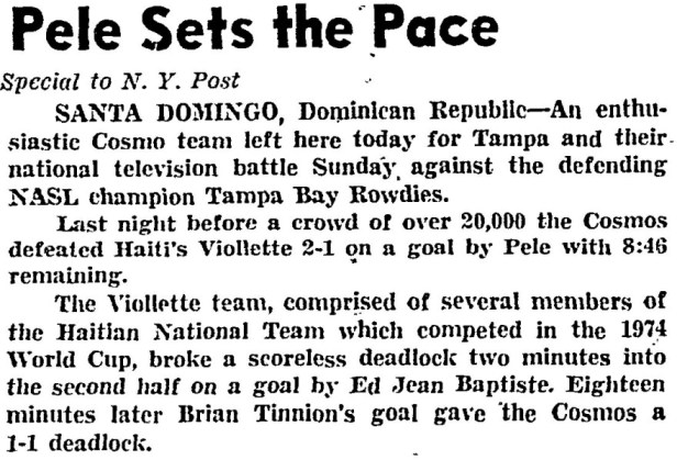 Domingo, Dominican Republic) Date: June 3, 1976 Cosmos won 2-1 Attendance: 20,000 Goal: Pele, Brian Tinnion Violette-Ed Jean Baptiste |