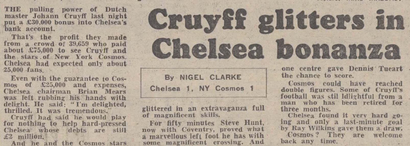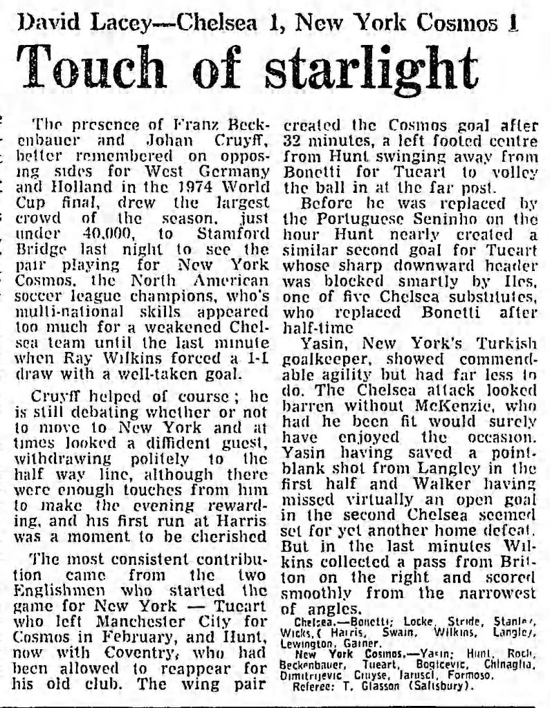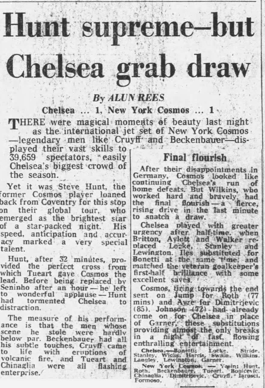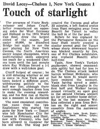 (England) Date: September 26, 1978 Cosmos tied 1-1 Attendance: 39,659 Goals: Cosmos-Dennis Tueart Chelsea-Ray Wilkins |