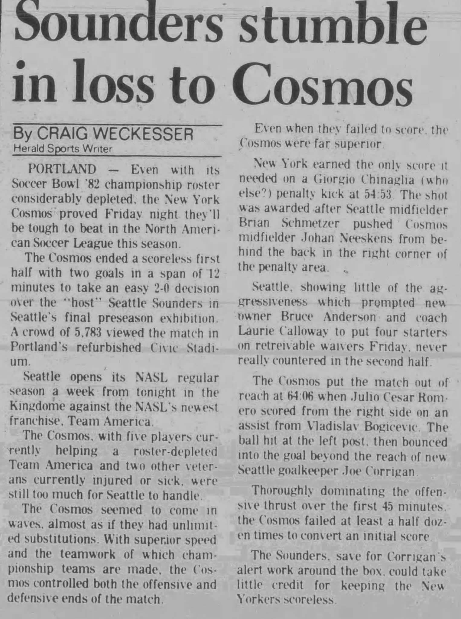 The Cosmos were outplayed for almost the entire game. After five straight impressive victories, the Cosmos lacked organization and coordination, passing sloppily and getting little support in midfield, especially from Roberto Cabanas, who was replaced by Angelo DiBernardo in the 70th minute.