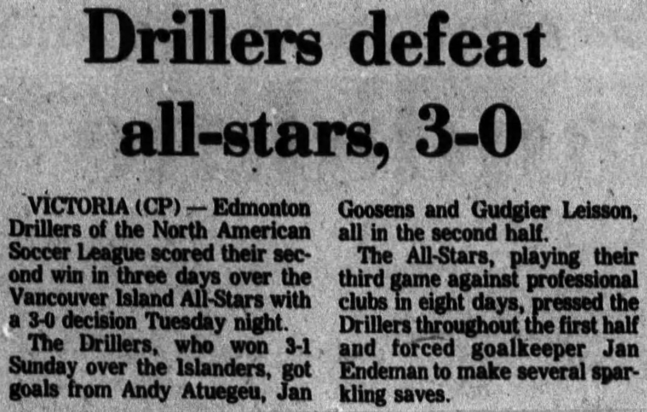 (Victoria, BC) Date: March 27, 1979 Drillers won 3-0 Attendance: Goals-Drillers-Andy Atuegbu, Jan Goossens, Gudgeir Leifsson |