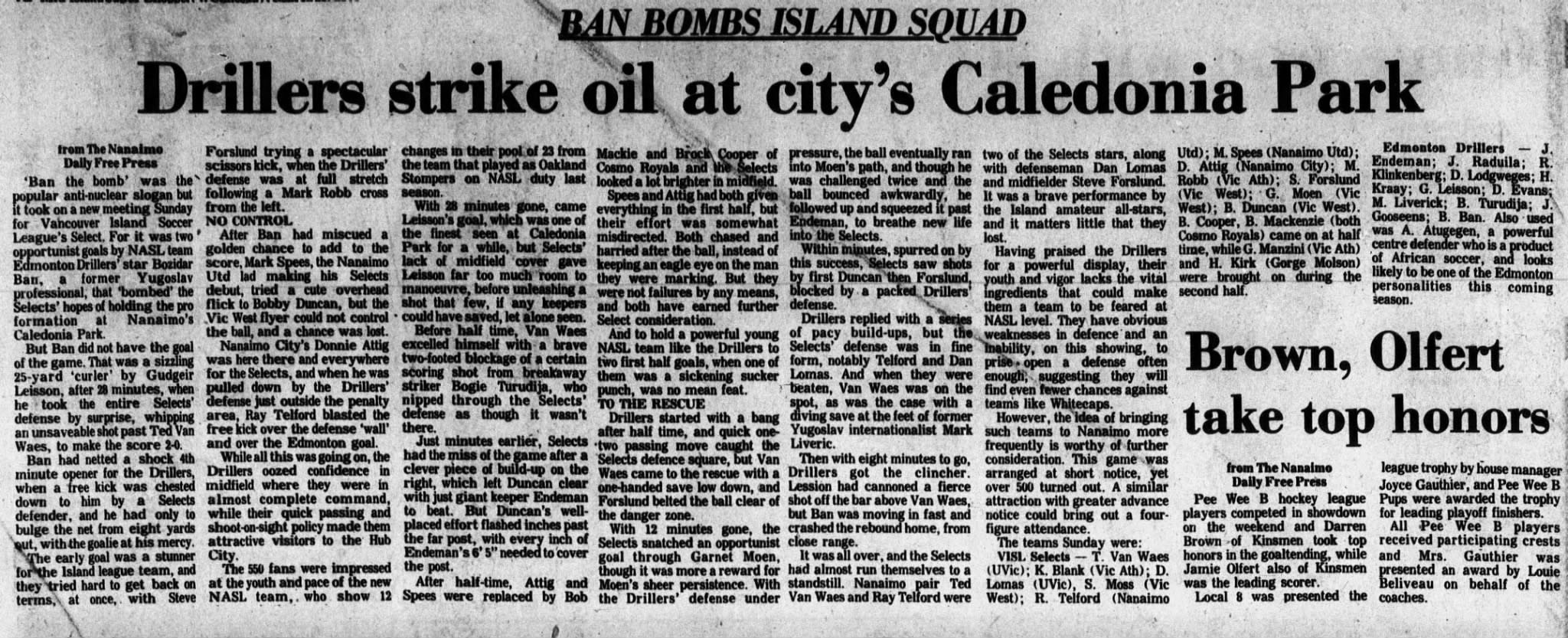 Selects Date: April 14, 1982 Drillers won 3-0 Attendance: 350 Goals: Drillers-Neill Roberts, Darren Poole, Brian Hornsby |
