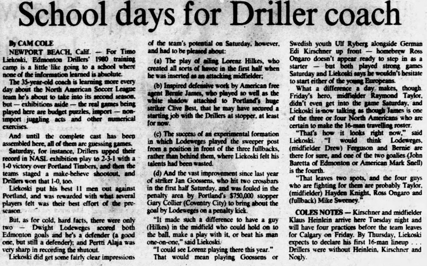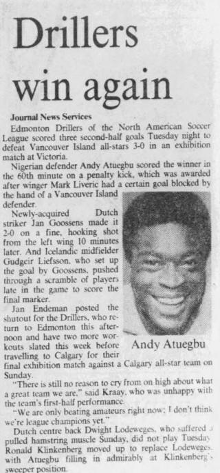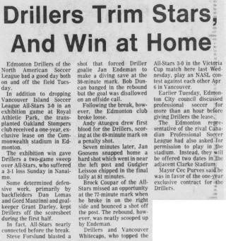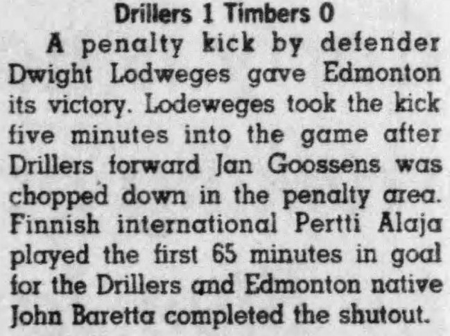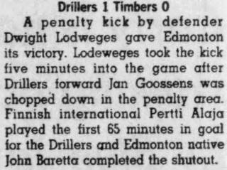 | Edmonton Drillers vs. Portland Timbers Date: March 30, 1980 Drillers won 1-0 Attendance: Goals: Drillers-Dwight Lodeweges |