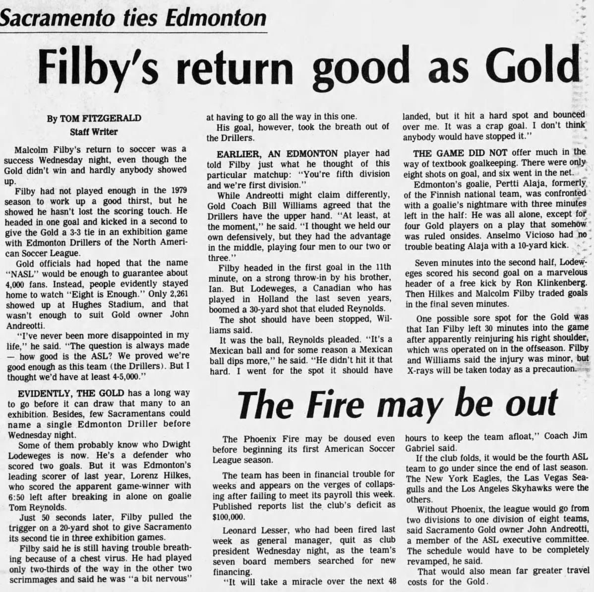(Sacramento, CA) Date: March 19, 1980 Drillers tied 3-3 Attendance: 2,261 Goals: Drillers-Lorenz Hilkes, Dwight Lodeweges (2) Gold-Malcolm Filby (2), Anselmo Vicioso |