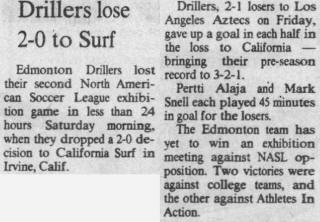 | Edmonton Drillers vs. California Surf (Irvine, California) Date: March 8, 1980 Drillers lost 2-0 Attendance: Goals: Surf- |
