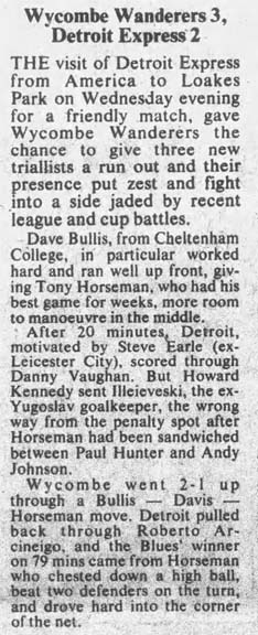 | Detroit Express at Wycombe Wanderers (England) Date: March 1, 1978 Express lost 3-2 Attendance: Goals: Express-Danny Vaughn, Roberto Arciniego Wycombe-Howard Kennedy, Horseman |