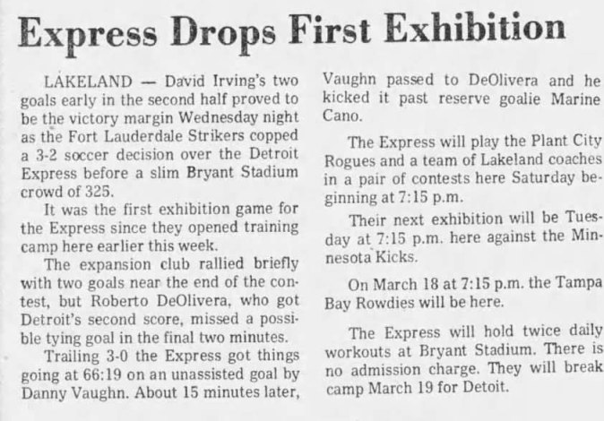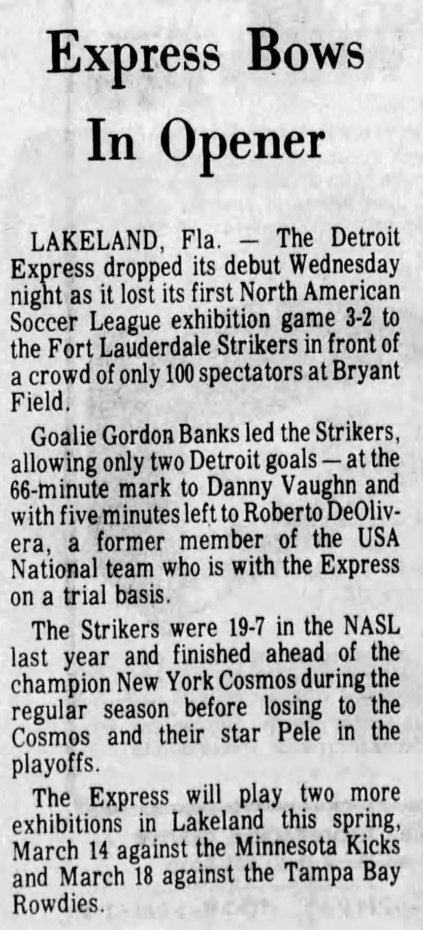 (Lakeland, Florida) Date: March 8, 1978 Express lost 3-2 Attendance: 325 Goals: Express-Danny Vaughn, Roberto DeOliveira |