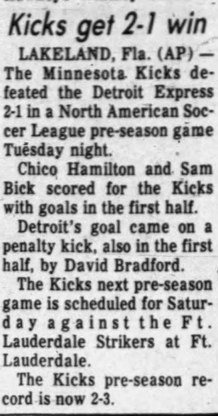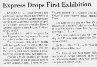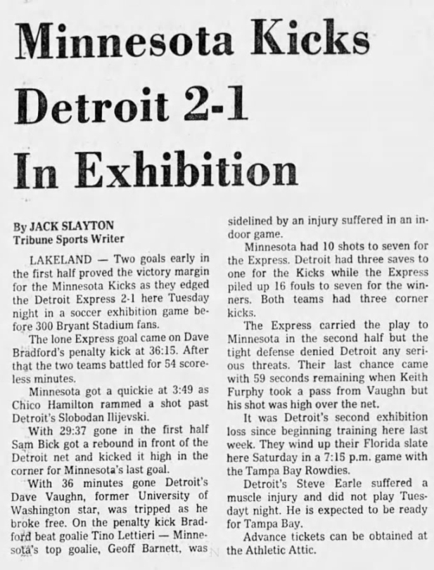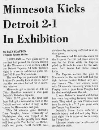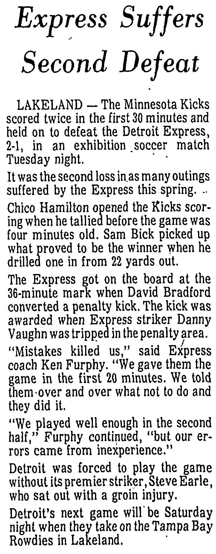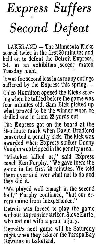 (Lakeland, Florida) Date: March 14, 1978 Express lost 2-1 Attendance: 300 Goals: Kicks-Ian Hamilton, Sam Bick Express-David Bradford |