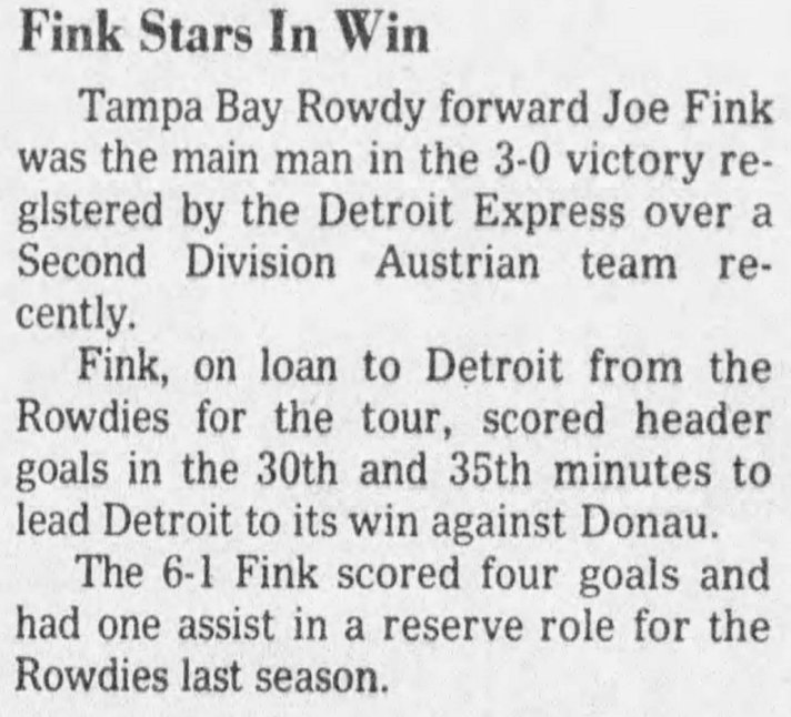 | Detroit Express at Doneau (Austria) Date: Sept 2x, 1978 Express won 3-0 Attendance: Goals: Express-Roman Rosul, Joey Fink, |