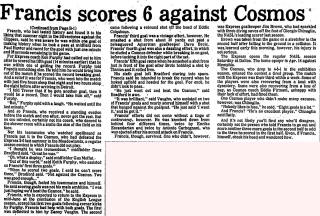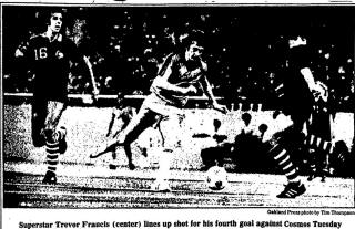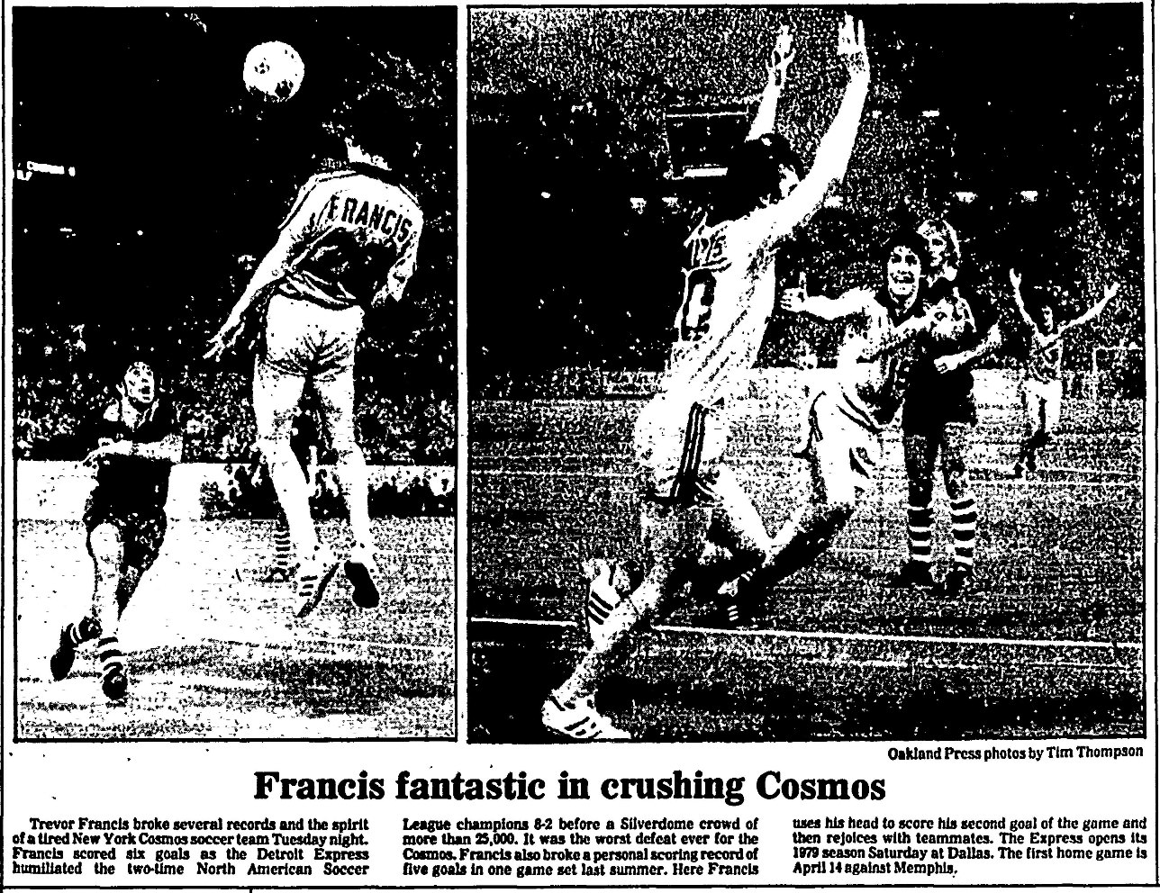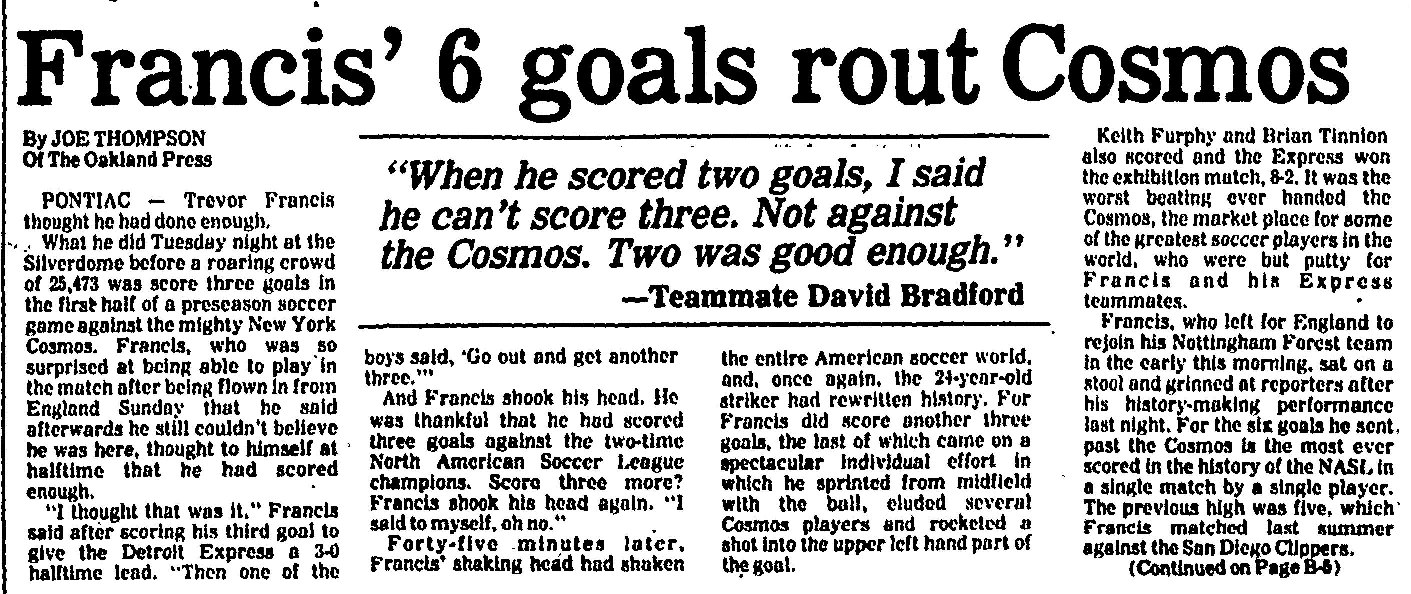 Michigan) Date: March 20, 1979 Express won 8-2 Attendance: 25,473 Goals: Express-Trevor Francis (6), Brian Tinnion, Keith Furphy Cosmos-Vladislav Bogicevic, Ricky Davis |