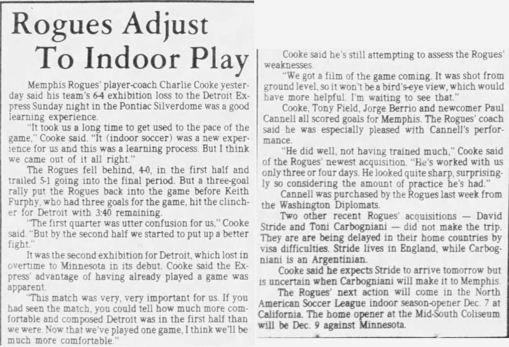 | Detroit Express at Reading (England) Date: February 21, 1978 Express tied 2-2 Attendance: Goals: Express-Keith Furphy (2) Reading |