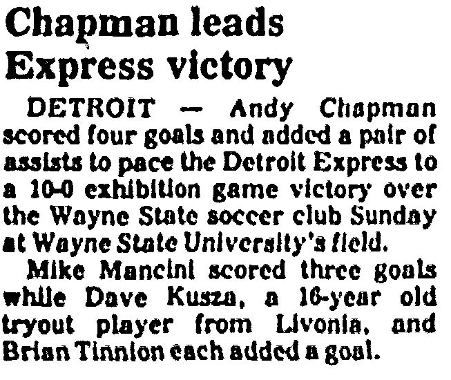 | Wayne State University vs. Detroit Express Date: May 17, 1981 Express won 10-0 Attendance Goals: Express-Mike Mancini (3), Dave Kusza, Brian Tinnion |