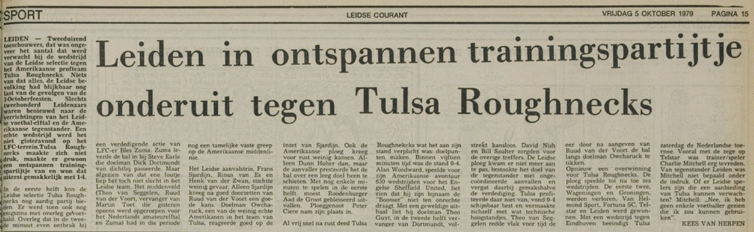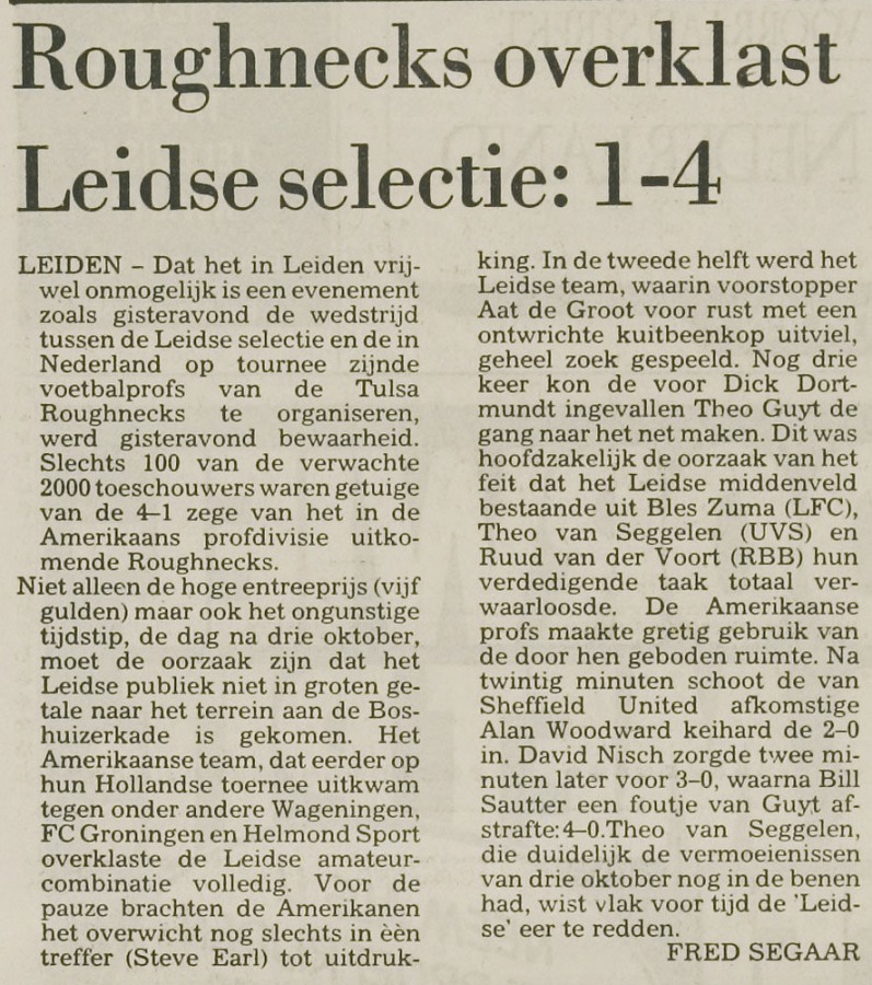 | Tulsa Roughnecks at Leiden (Leiden, Netherlands) Date: October 4, 1979 Roughnecks won 4-1 Attendance: Goals: Roughnecks-Steve Earle, Alan Woodward, David Nish, Billy Sautter |