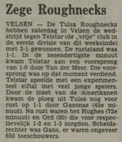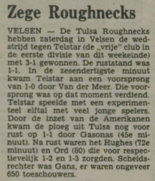 | Tulsa Roughnecks at Telstar (Velsen, Netherlands) Date: September 29, 1979 Roughnecks won 3-1 Attendance: |