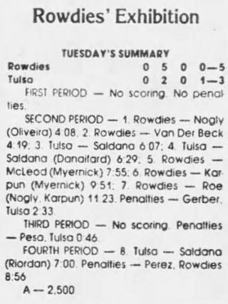 | Tulsa Roughnecks at Ft. Lauderdale Strikers Date: March 22, 1982 Roughnecks lost 3-0 Attendance: 4,212 Goals: Strikers-Thomas Rongen, Brian Kidd (2) |