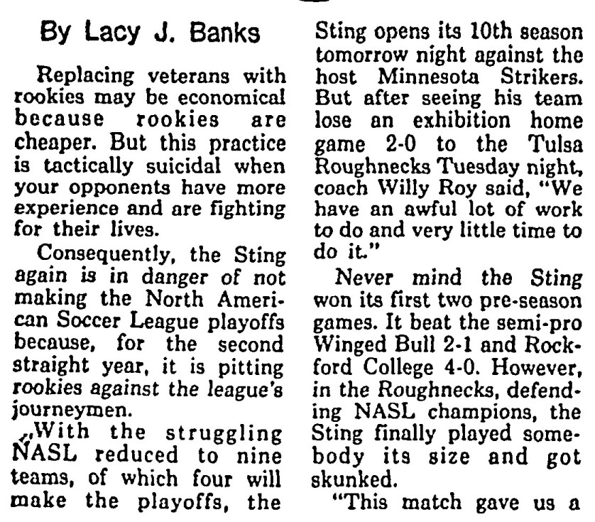 | Tulsa Roughnecks at Chicago Sting Date: May 8, 1984 Roughnecks won 2-0 Attendance: 2,000 Goals: Roughnecks-Chance Fry, Brian Schmetzer |