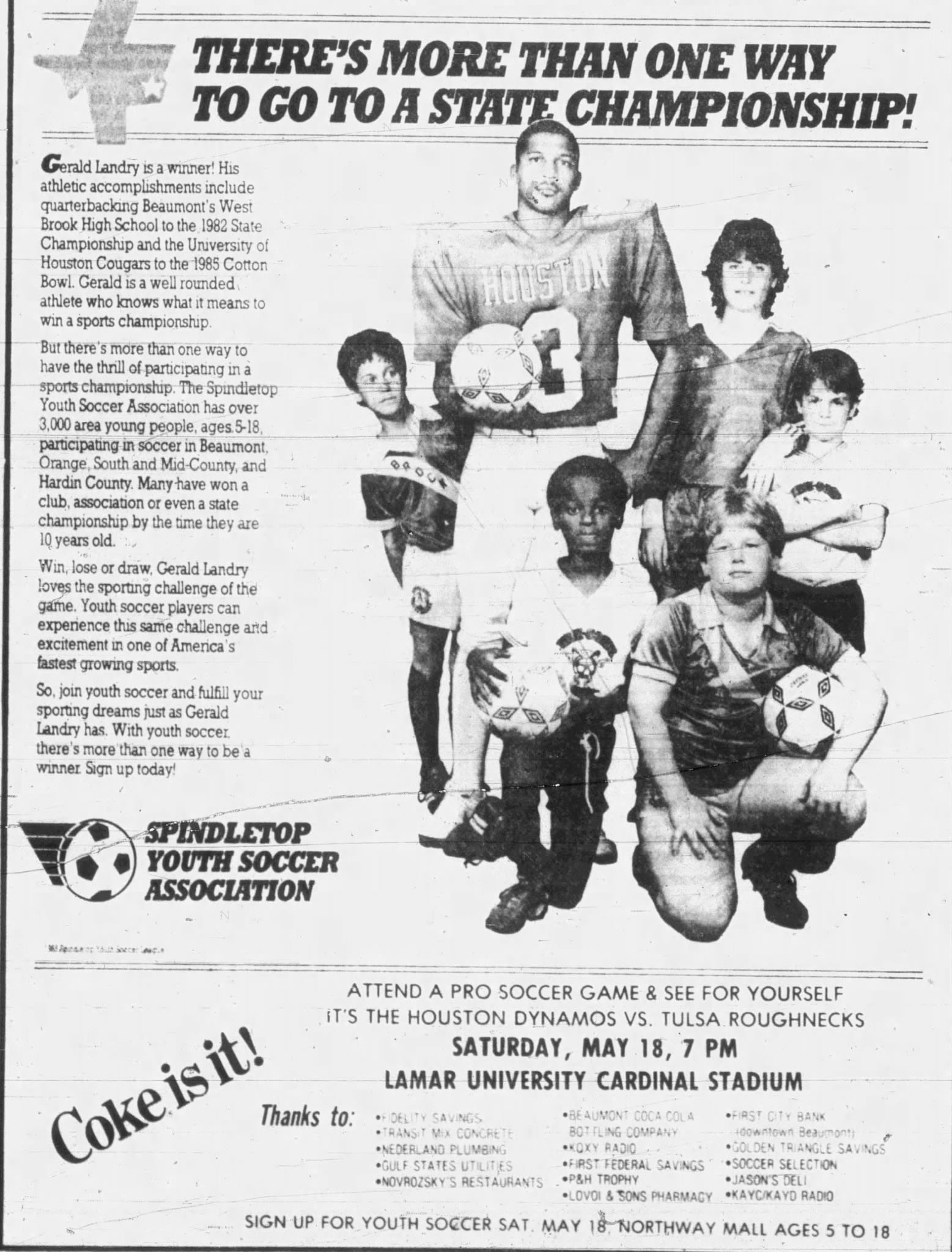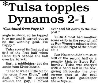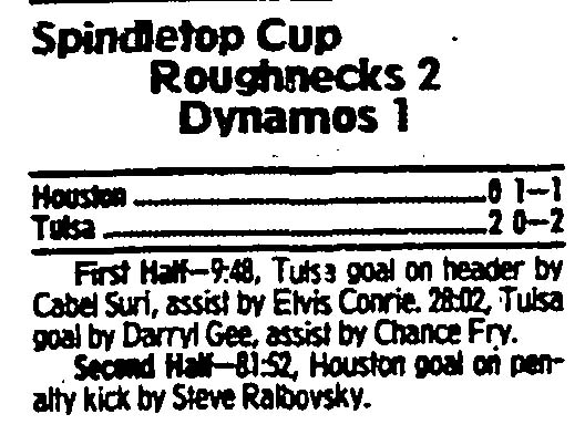 | Tulsa Roughnecks at Houston Dynamos (USL) Date: June 1, 1985 Roughnecks tied 2-2 Attendance: 2,011 Goals: Roughnecks-Elvis Comrie, Chance Fry |