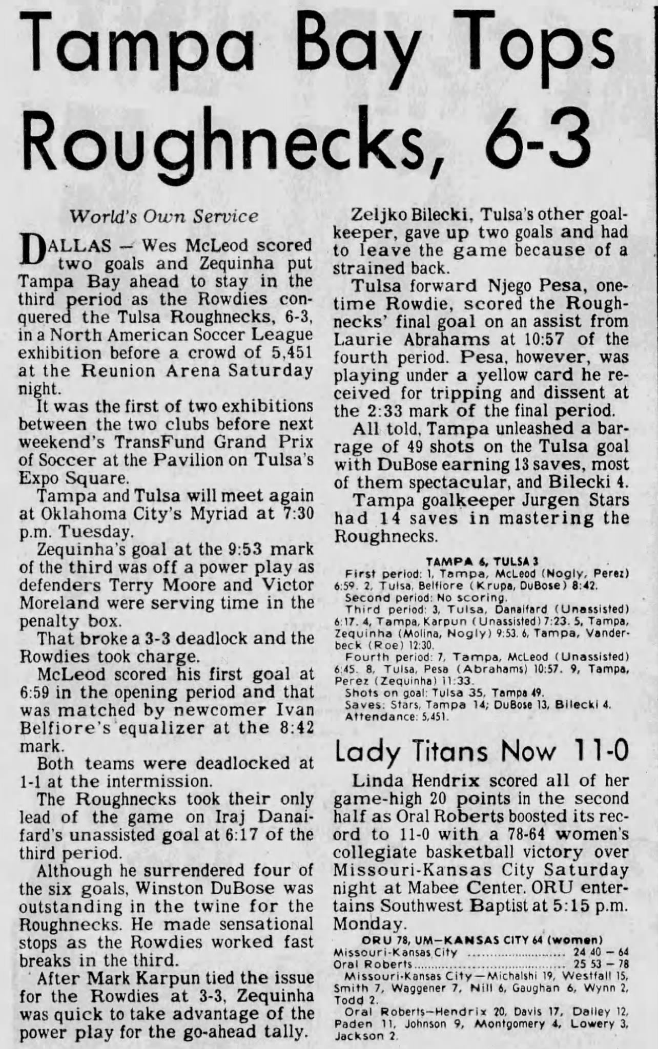 | Tulsa Roughnecks vs. University of Tampa Date: March 24, 1982 Roughnecks won 4-1 Attendance: Goals: Roughnecks-Ole Mikkelsen (2), Laurie Abrahams (2) |