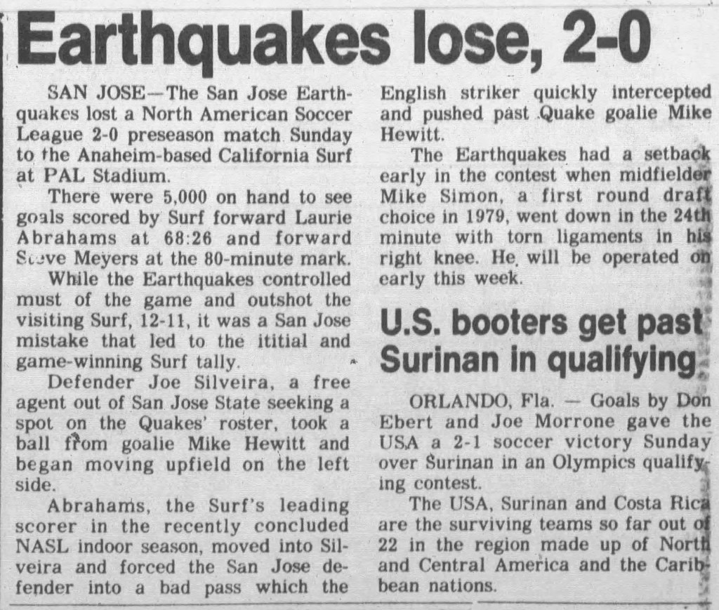 | California Surf at San Jose Earthquakes Date: March 16, 1980 Surf won 2-0 Attendance: 5,000 Goals: Surf-Laurie Abrahams, Steve Moyers |