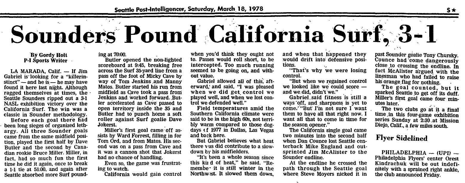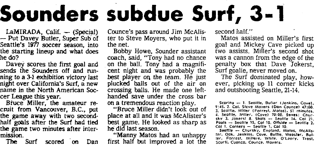 Mirada, California) Date: March 17, 1978 Surf lost 3-1 Attendance: Goals: Surf-Steve Moyers Sounders-Dave Butler, Bruce Miller (2) |