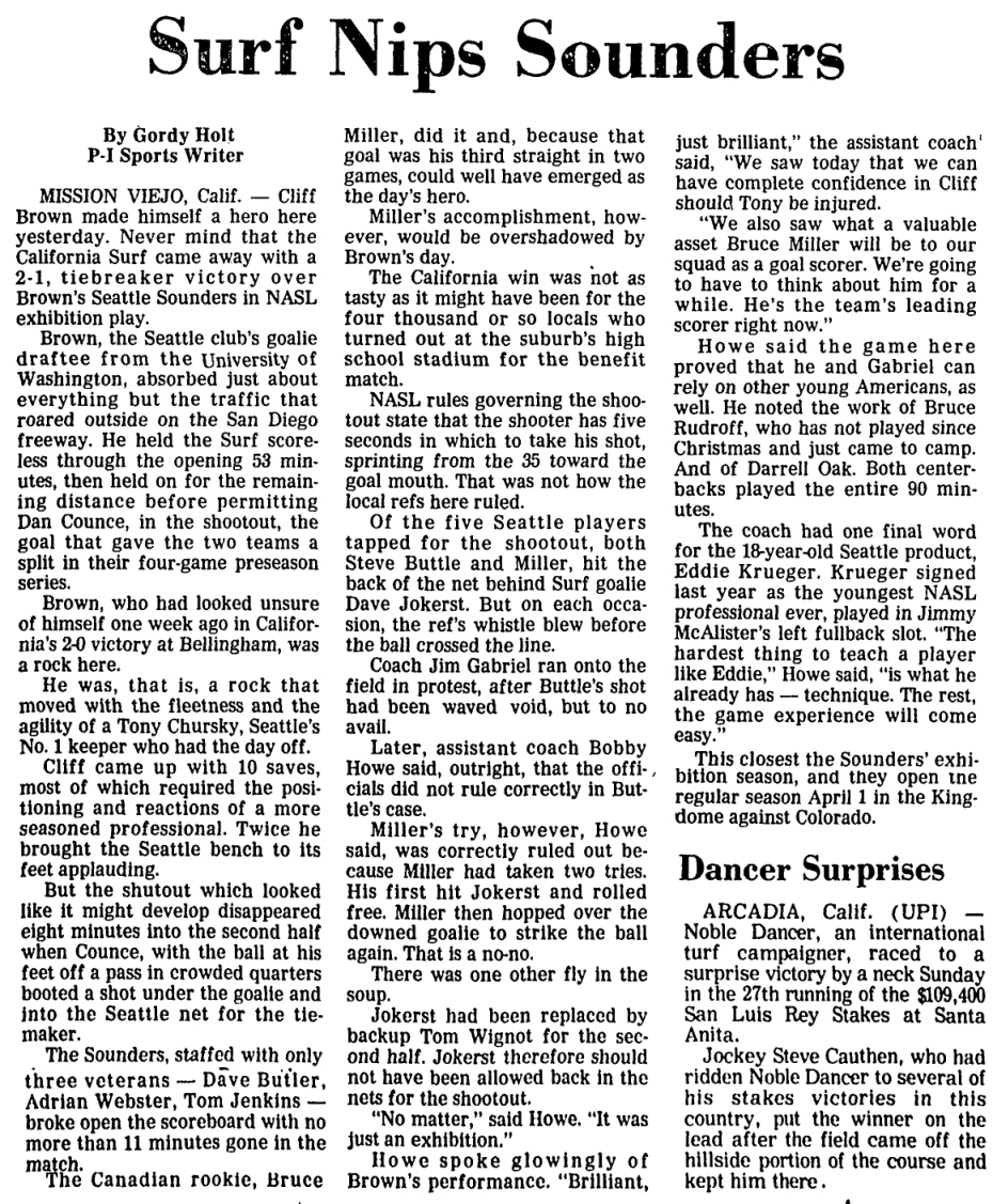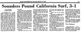 Viejo, California) Date: March 19, 1978 Surf won 2-1 Attendance: 4,000 Goals: Surf-Dan Counce, Shoot out Sounders-Bruce Miller |