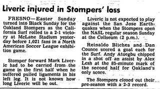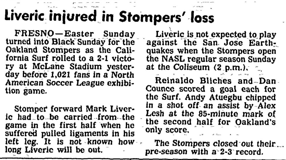 | California Surf vs. Oakland Stompers (Fresno, California) Date: March 26, 1978 Surf won 2-1 Attendance: 1,021 Goals: Surf-Reinaldo Bliches, Dan Counce Stompers-Andy Atuegbu |