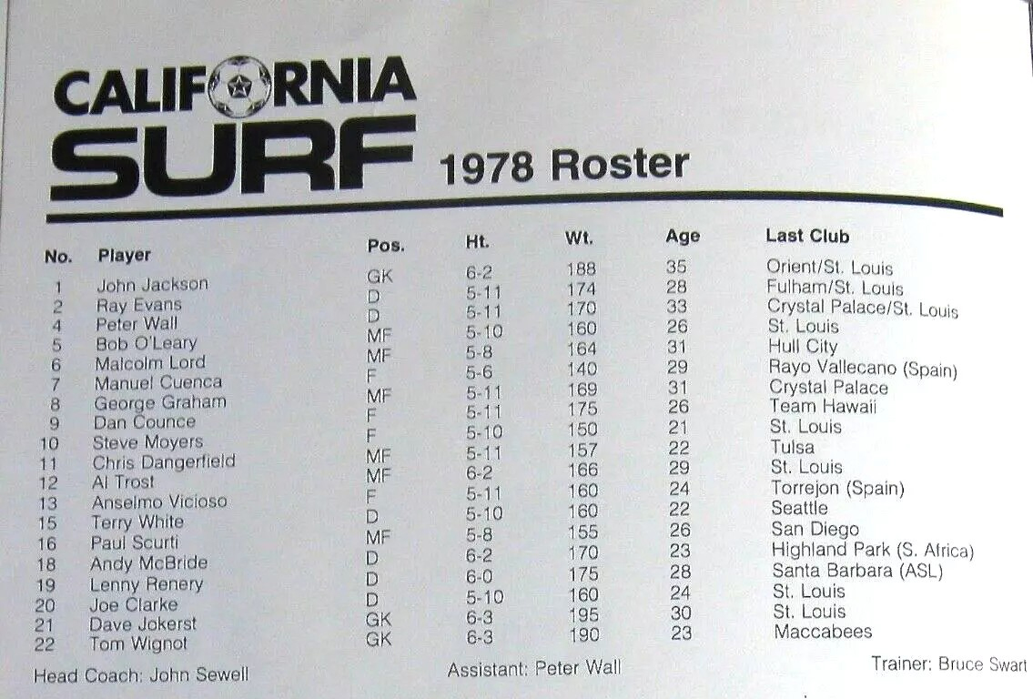 | Brighton Seagulls (England) at California Surf Date: May 14, 1979 Surf tied 1-1 Attendance: 3,044 Goals: Surf-Craig Allen Brighton-Malcolm Poakett |
