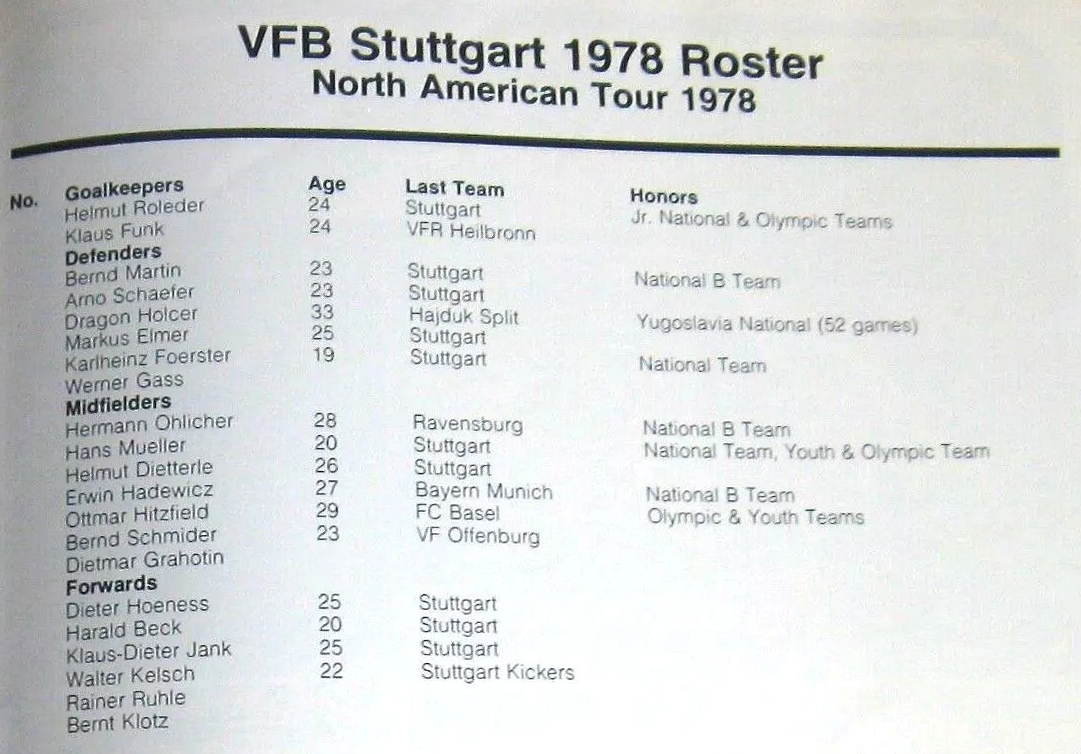 | VfB Stuttgart (Germany) at California Surf Date: May 12, 1978 Surf lost 1-0 Attendance: 16,252 Goals: Stuttgart-Ervin Hadevicz |