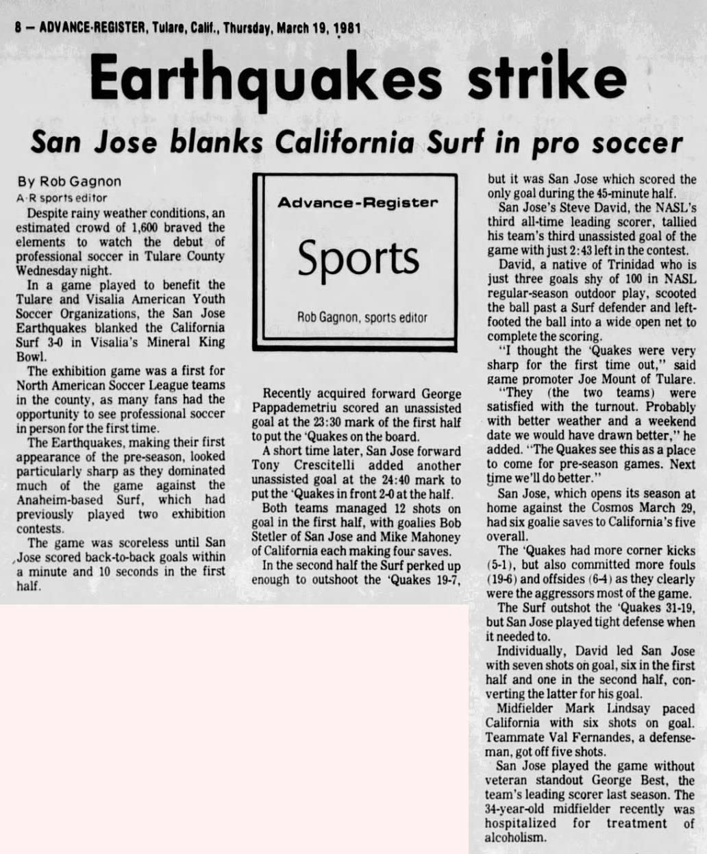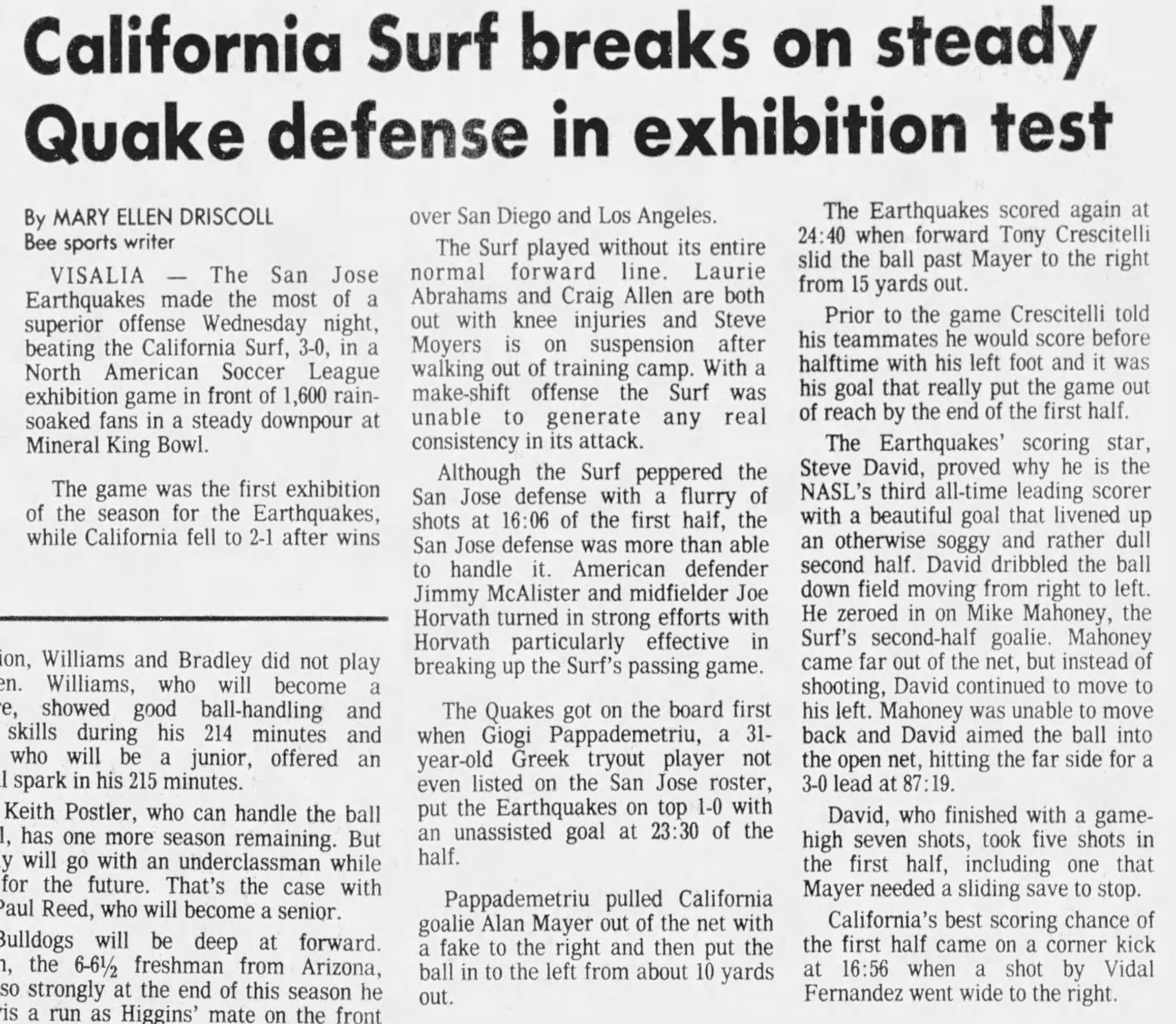 (Visalia, California) Date: March 18, 1981 Surf lost 3-0 Attendance: 1,600 Goals: Earthquakes-George Pappademetriu, Tony Crescitelli, Steve David |