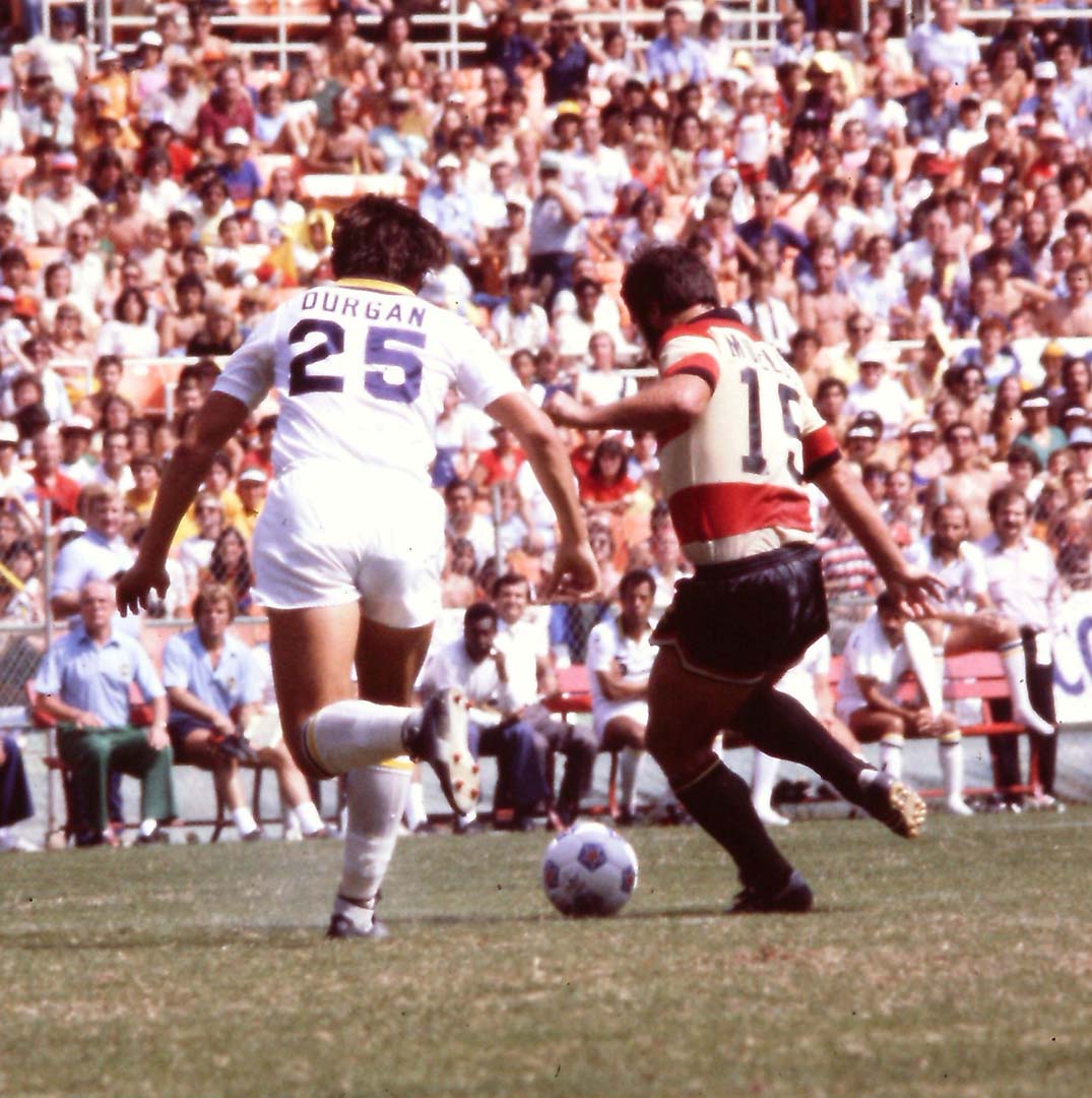![]() Vladislav Bogicevic (8), Nicky Reid (13), Kenny Hibbitt (3), Jeff Durgan (4) Seattle Sounders vs. New York Cosmos Soccer Bowl 1982 San Diego, California |